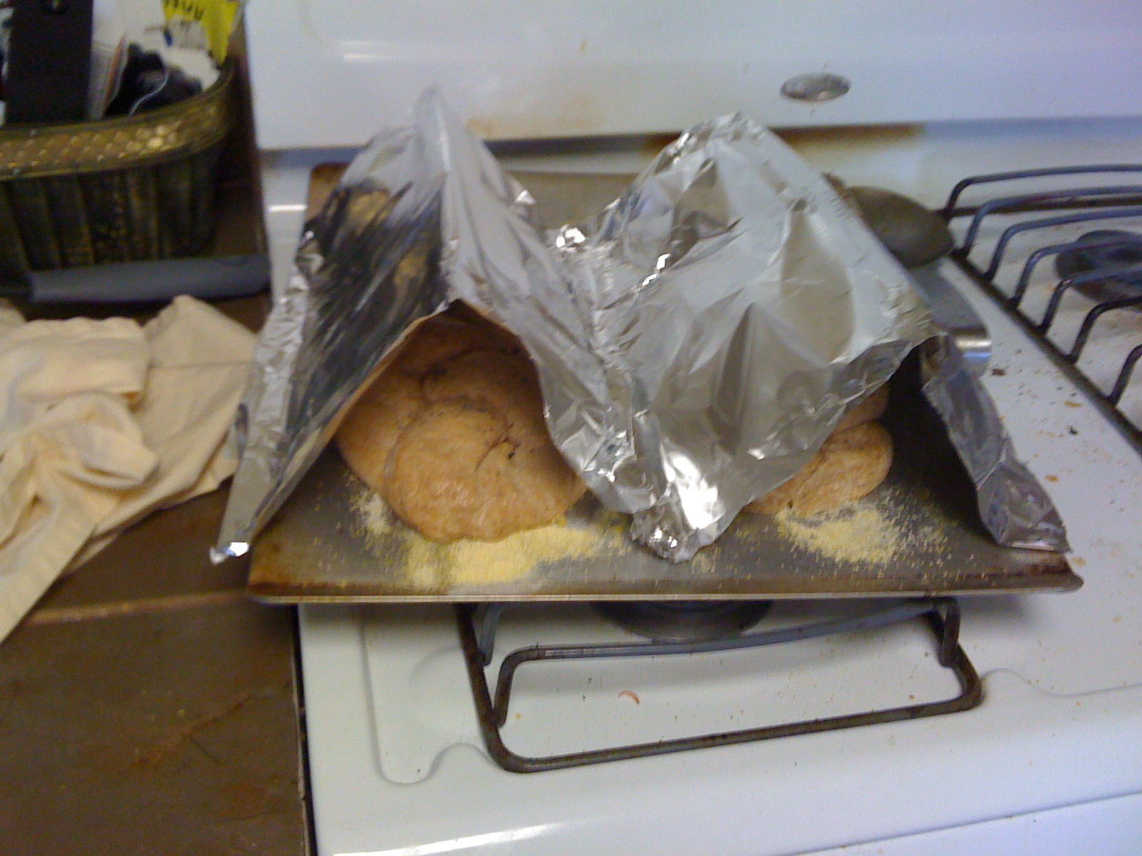 I placed both loaves on a cookie sheet, covered them, and then let them rise in the warmish oven for another hour. I also placed a bowl of water in the bottom to keep things moist.